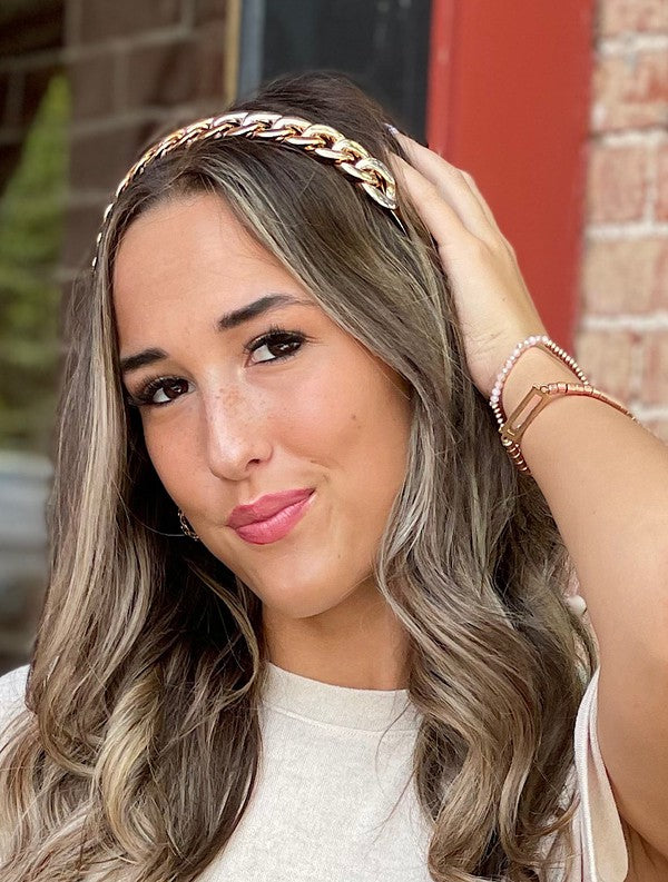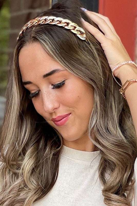 Cuban Chains!! Your hair style will dazzle in these elegant headbands. Made of 18k gold plating featuring an oversized gold chain. Will coordinate perfectly with all of your favorite gold pieces. The chain does stop right before the ears making them more comfortable to wear.