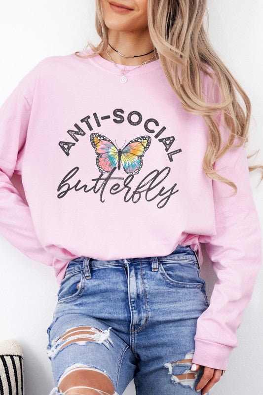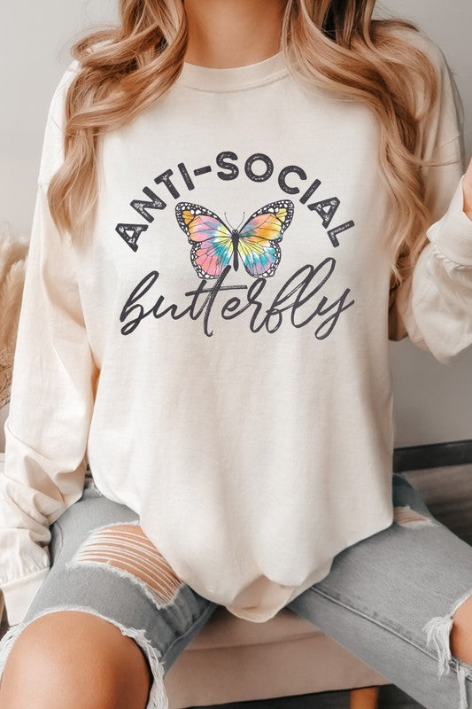 This Antisocial Butterfly graphic tee is printed on the Comfort Colors 6014 style Long Sleeve Shirt. This item is Unisex sized so it runs large compared to women's sizing. The design is printed with ink, not applied as a transfer, so it's a high quality graphic that should last the lifetime of the shirt!