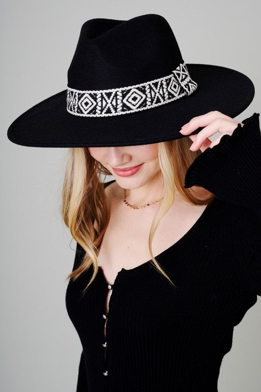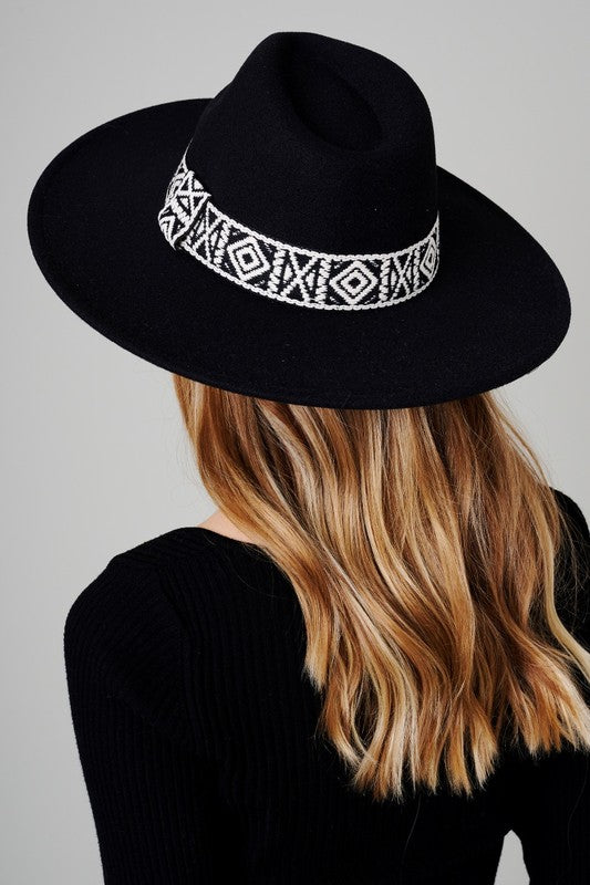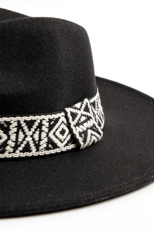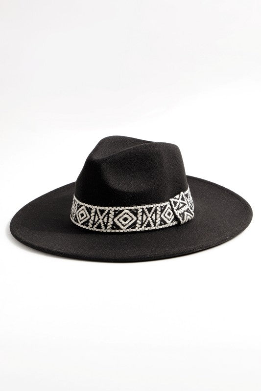 Felt fedora hat with aztec print strap. Has size adjustable strap inside. Head circumference: 23" Brim size: 3.75" Material: 100% Polyester
