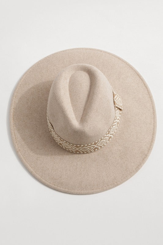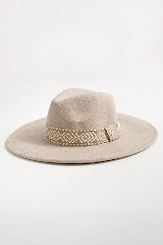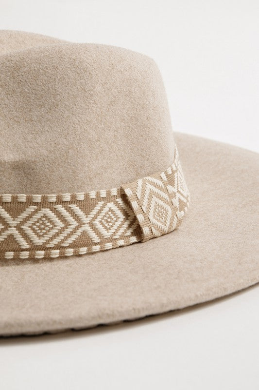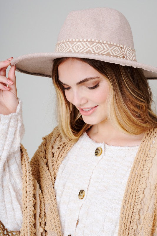 Felt fedora hat with aztec print strap. Has size adjustable strap inside. Head circumference: 23" Brim size: 3.7" Material: 100% Polyester