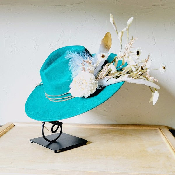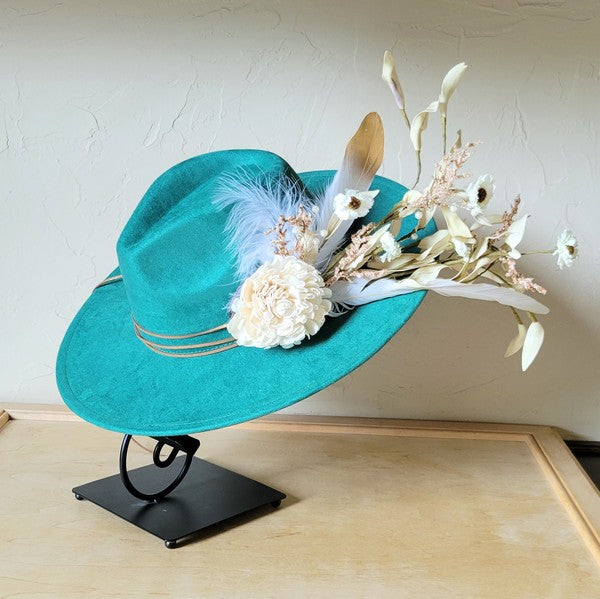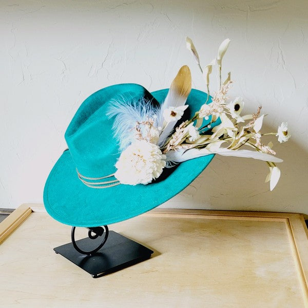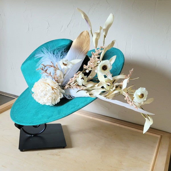 Hats are shipped with feather and leather band separately and will need to be assembled once received by wrapping three times around the hat and securing by tie.