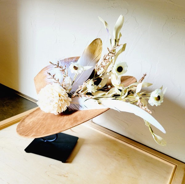 Hats are shipped with feather and leather band separately and will need to be assembled once received by wrapping three times around the hat and securing by tie.