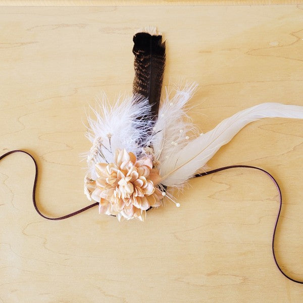 Elevate your boho western wedding with our bridal hat collection. This wedding hat band features neutral tones and a touch of blush/pink/apricot. Adorn any hat with flowers, feathers, and floral picks.