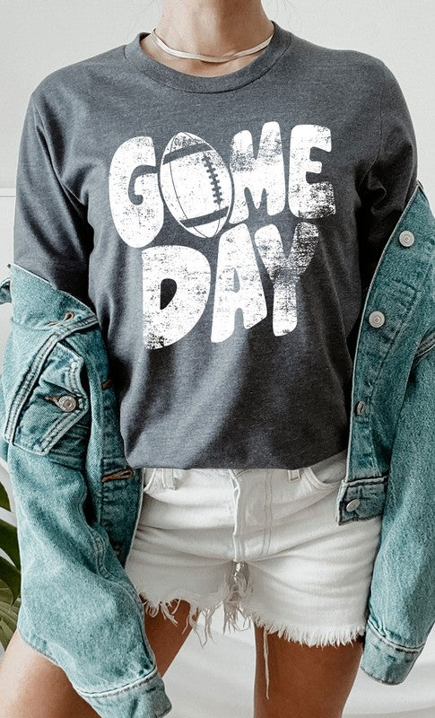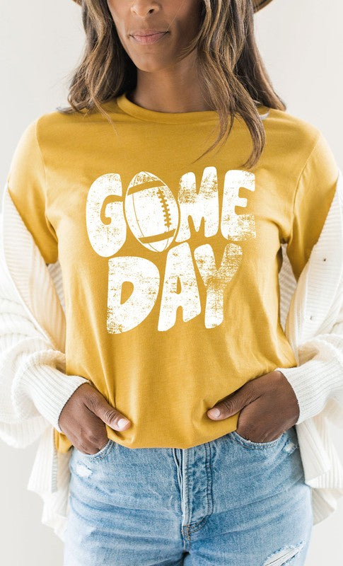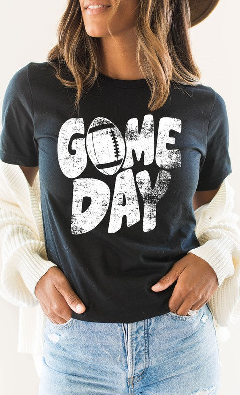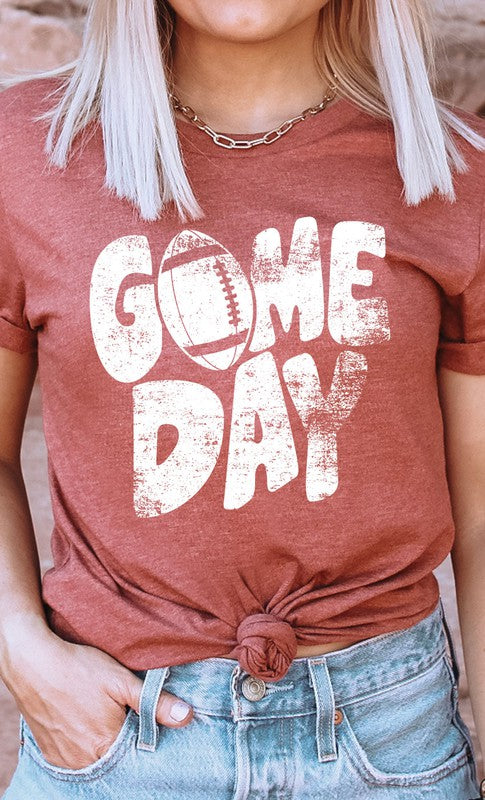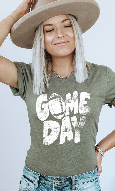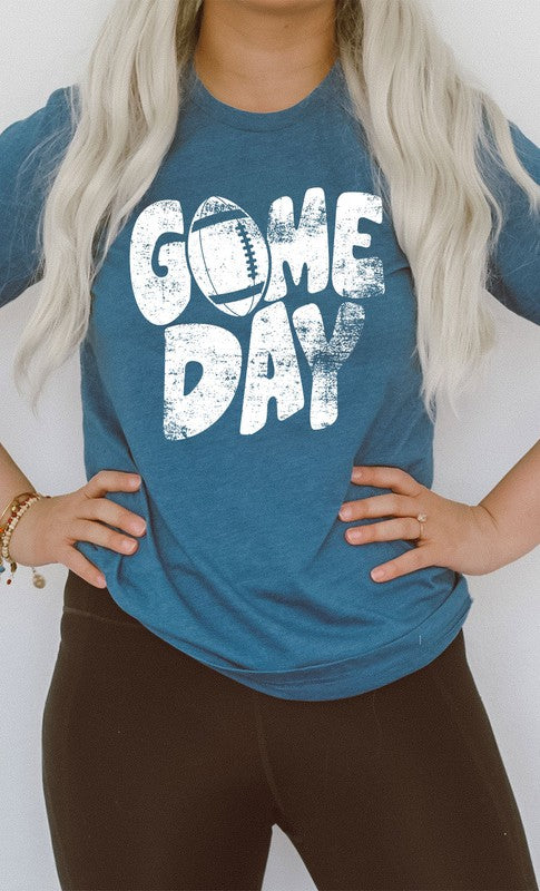 Introducing the Distressed Game Day Football Graphic Tee from Kissed Apparel. Amp up your merchandise with this vintage-inspired design. Featuring a worn and distressed look, it adds a rugged charm to any outfit. Most t-shirt colors are 52/48 cotton/poly blend. Perfect for sports enthusiasts and game day events. Order now to enhance your business's fashion line and score big with your customers.