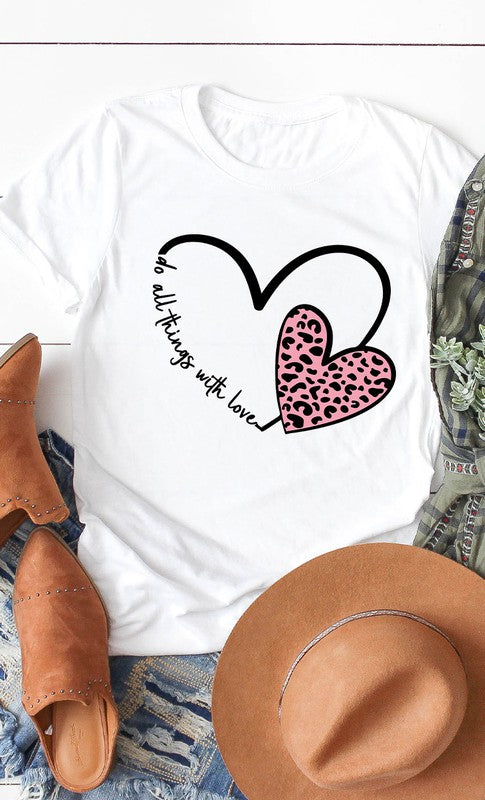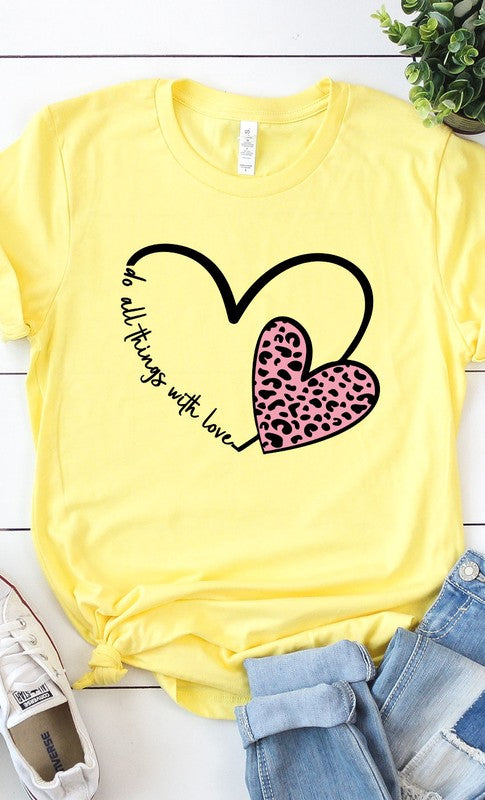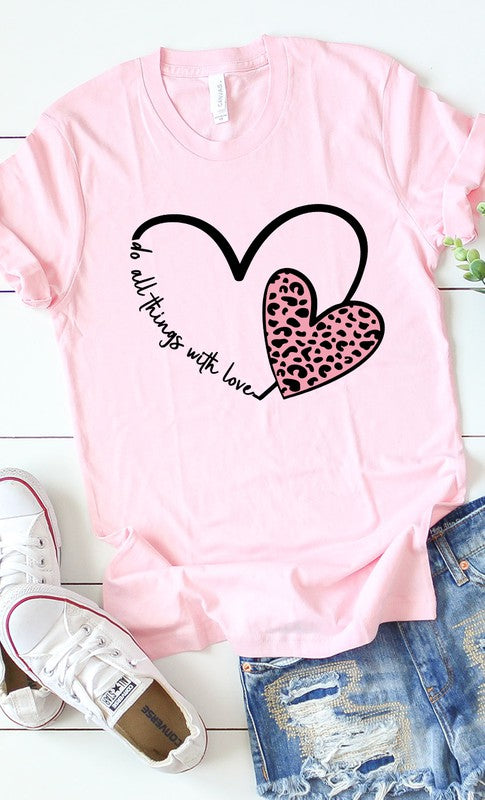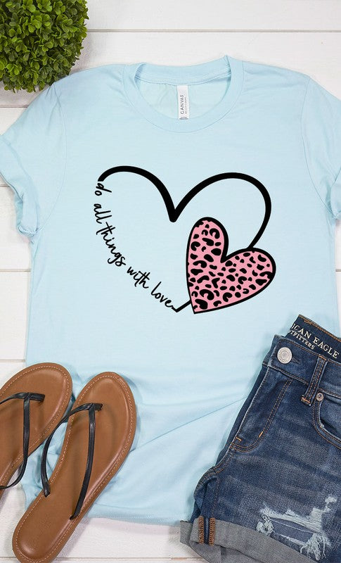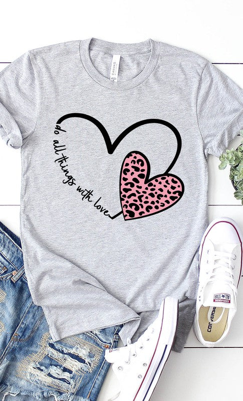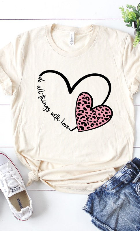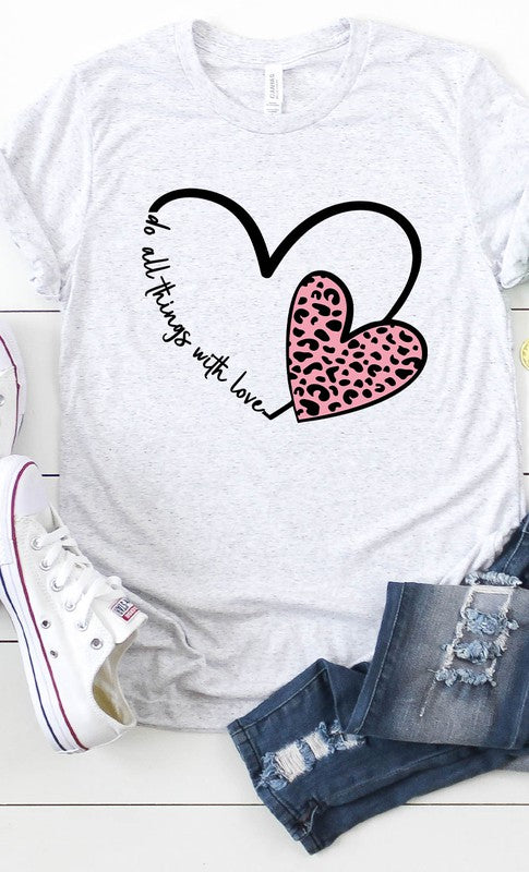 Do All Things With Love Graphic Tee. Most t-shirt colors are 52/48 Airlume combed and ringspun cotton/polyester, Athletic Heather & Black Heather are 90/10 airlume combed and ringspun cotton/polyester.