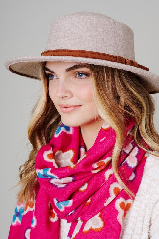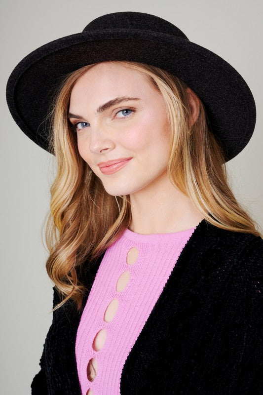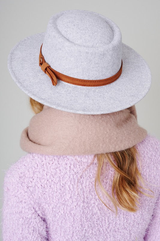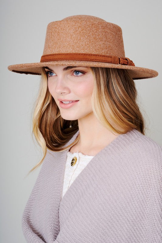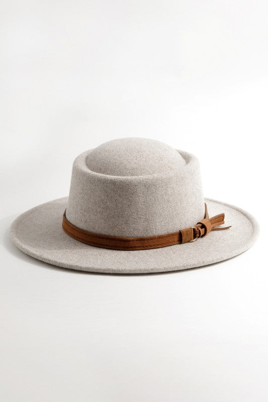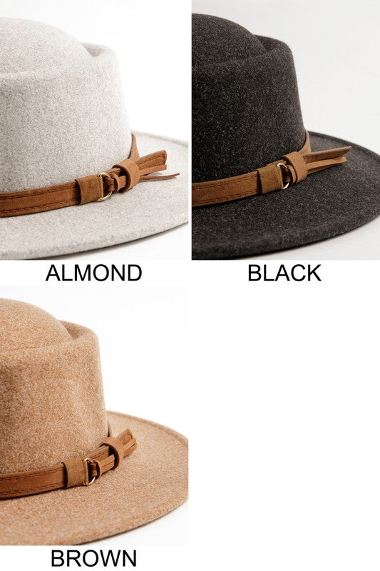 Felt fedora hat, leather belt strap can be taken off. Has size adjustable strap inside. Head circumference: 23" Brim size: 3" Material: 100% Polyester
