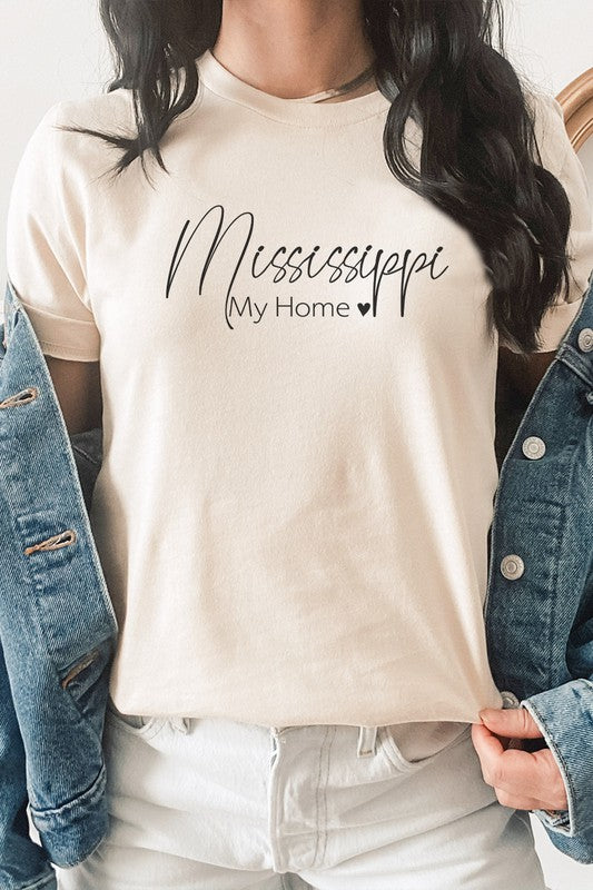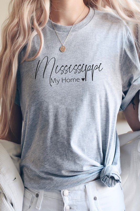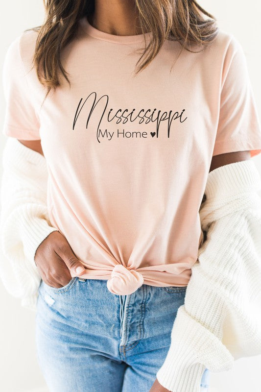 Mississippians can show their love for their home state with this stylish Mississippi My Home Heart State Graphic Tee. Featuring a beautiful red heart with the word \"Mississippi\" in bold white letters, this tee is perfect for showing your southern pride. Most t shirt colors are 52/48 cotton/poly blend. White and Cream tees are 100% cotton, Ash tees are 99/1 cotton/poly. Available in various sizes, this tee is a great addition to any Mississippian's wardrobe. By Kissed Apparel.