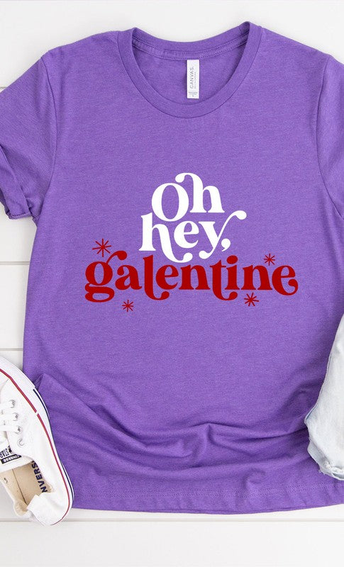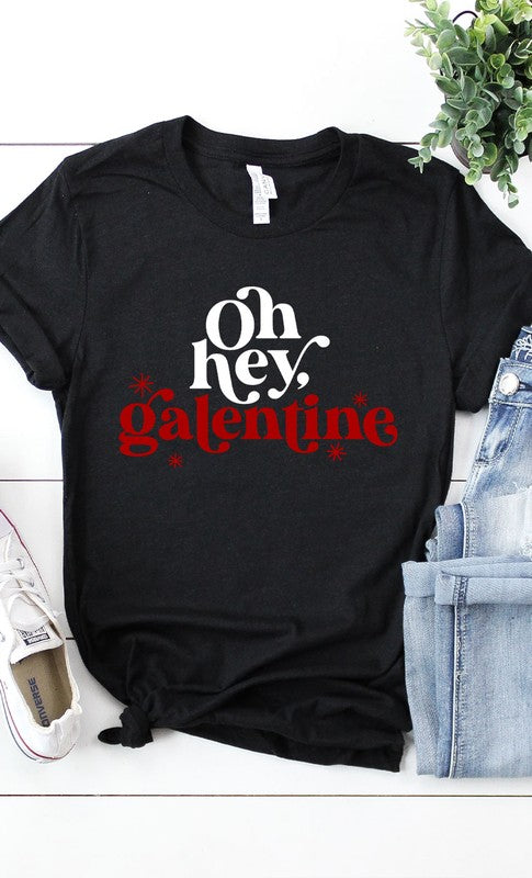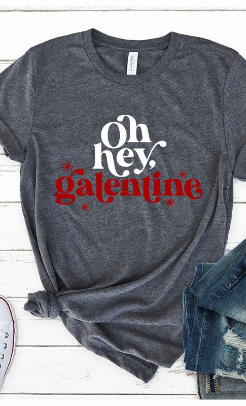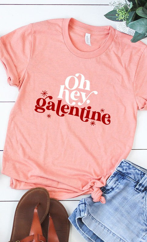 Oh Hey Galentine Graphic Tee. Most t-shirt colors are 52/48 Airlume combed and ringspun cotton/polyester, Athletic Heather & Black Heather are 90/10 airlume combed and ringspun cotton/polyester.
