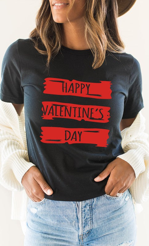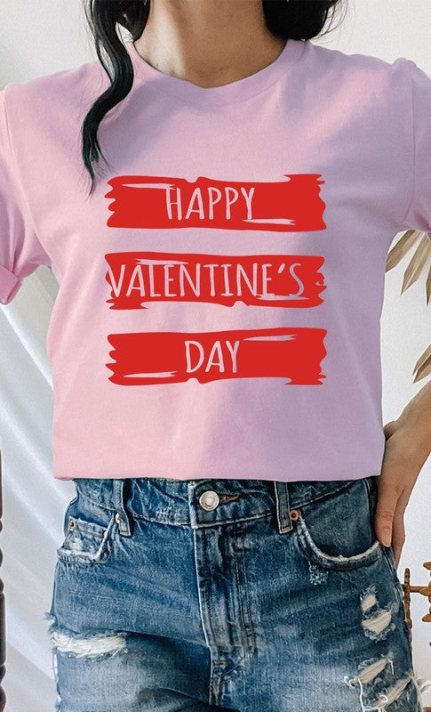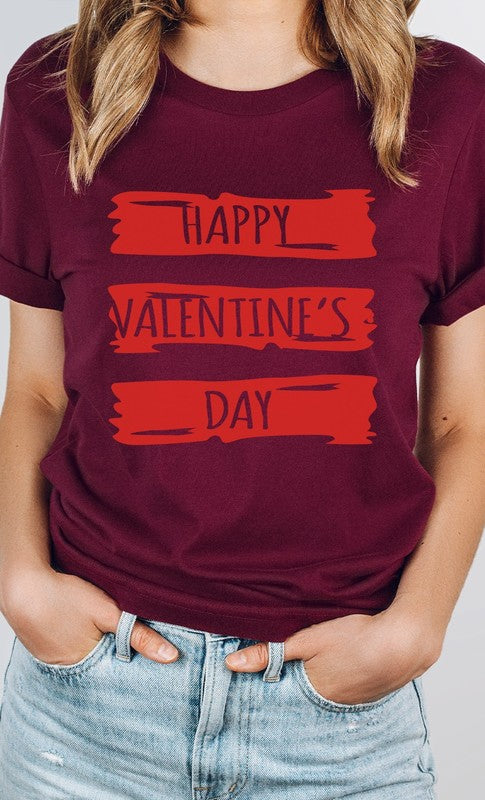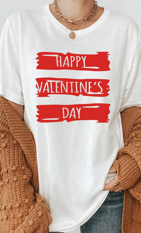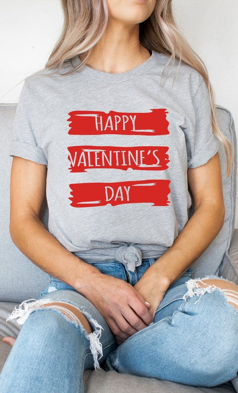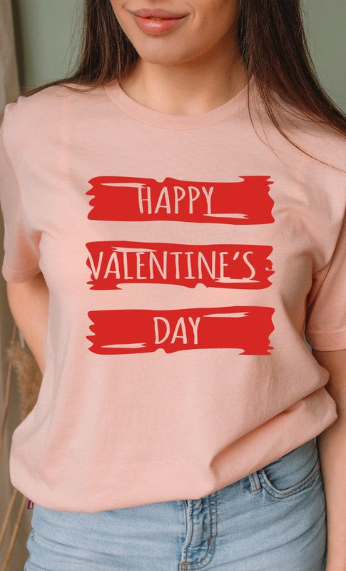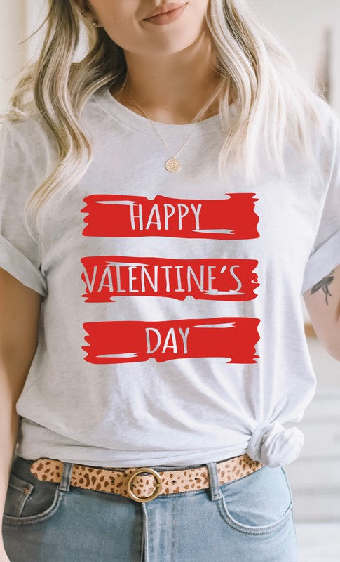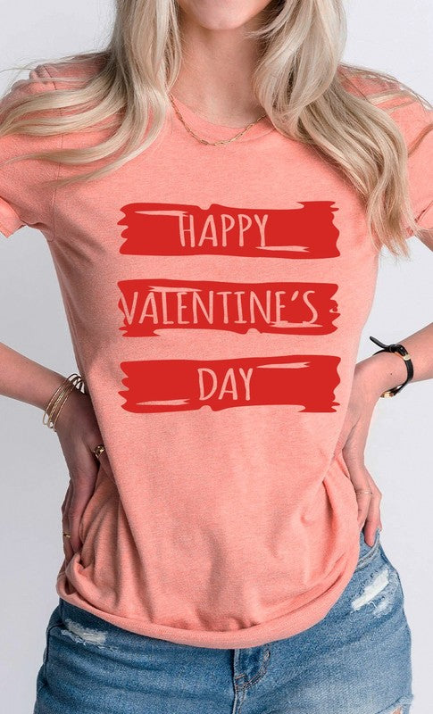 Paint Smudge Happy Valentines Day Graphic Tee. Most t-shirt colors are 52/48 cotton/polyester blend. Athletic Heather & Black Heather are 90/10 cotton/polyester. White, cream and pink are 100% cotton. Ash is 99/1.