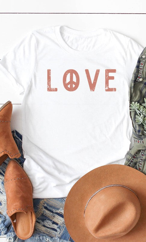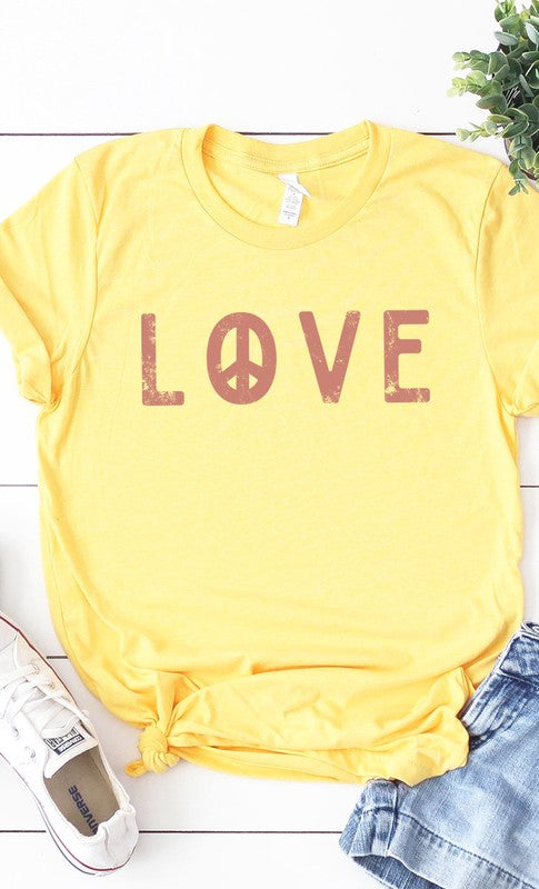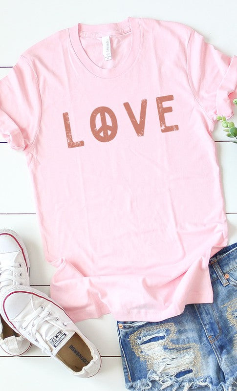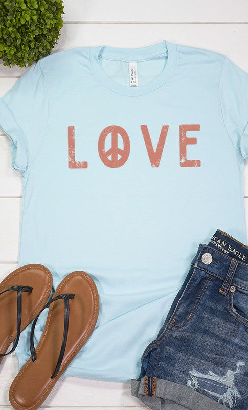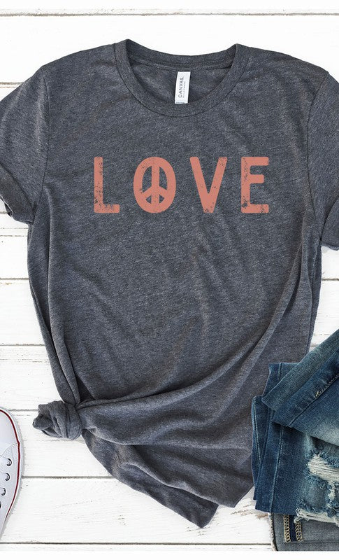 Peace Love Graphic Tee. Most t-shirt colors are 52/48 Airlume combed and ringspun cotton/polyester, Athletic Heather & Black Heather are 90/10 airlume combed and ringspun cotton/polyester. White, cream, canvas red, lilac, mint are 100% cotton.