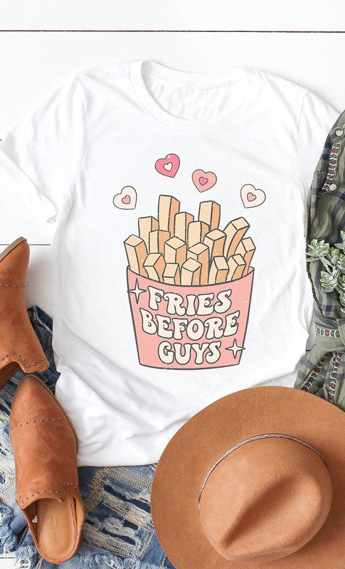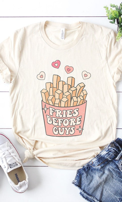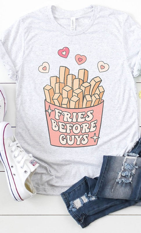 Retro Fries Before Guys Graphc Tee. White and Cream are 100% airlume combed and ringspun cotton, Ash is 99/1 airlume combed and ringspun cotton/polyester