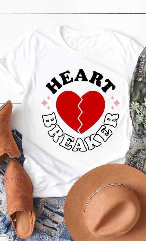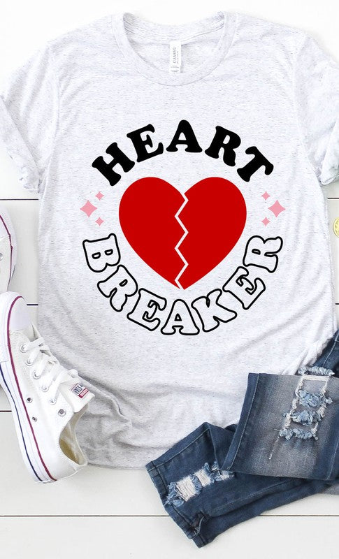 Retro Heart Breaker Graphic Tee. Most t-shirt colors are 52/48 Airlume combed and ringspun cotton/polyester, Athletic Heather & Black Heather are 90/10 airlume combed and ringspun cotton/polyester. White, cream, canvas red, lilac, mint are 100% cotton.