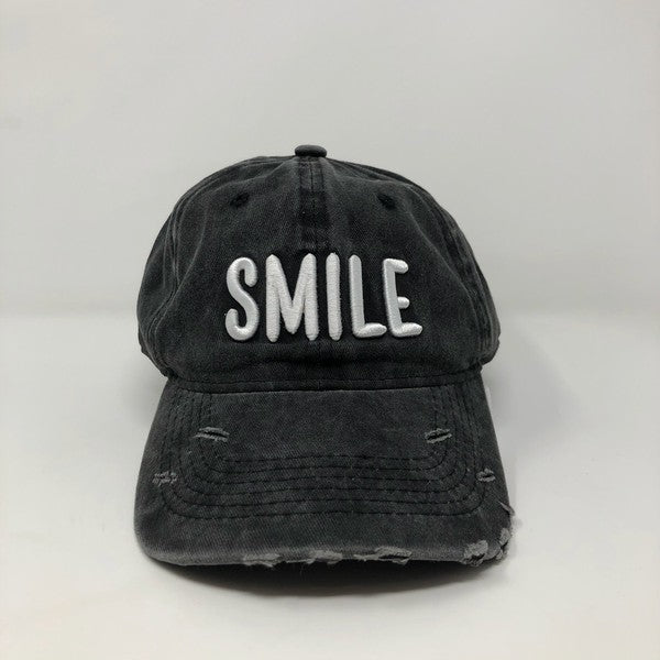 Let's smile and be happy with this cute "SMILE" hat. Neutral dark gray distressed base ball cap with white embroidery on the front. Feautures a curved bill and finished with an adjustable strap at the back. This hat is perfect for summer!